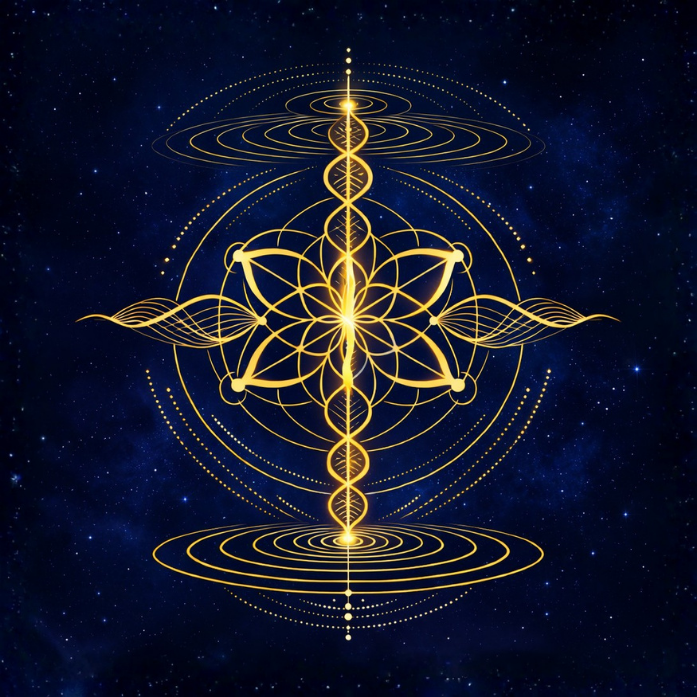 L’asse verticale è attraversato da una spirale che richiama il DNA, la nostra memoria strutturale più antica: un richiamo alla continuità tra materia e coscienza, tra corpo e spirito, tra memoria e campo.