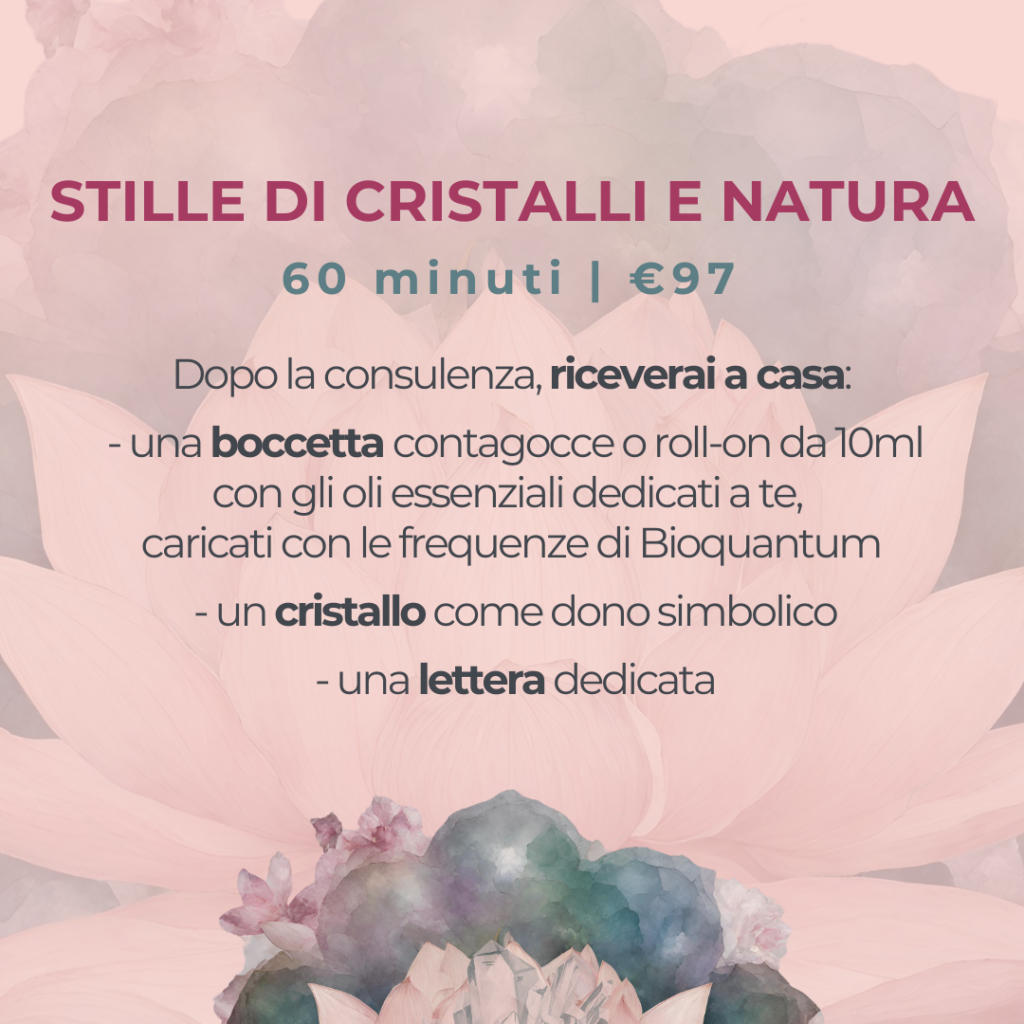 I cristalli accompagnano i nostri giorni con le loro splendide e potenti energie. Questa consulenza è un momento fuori dal tempo e dallo spazio, dedicato solo a te.