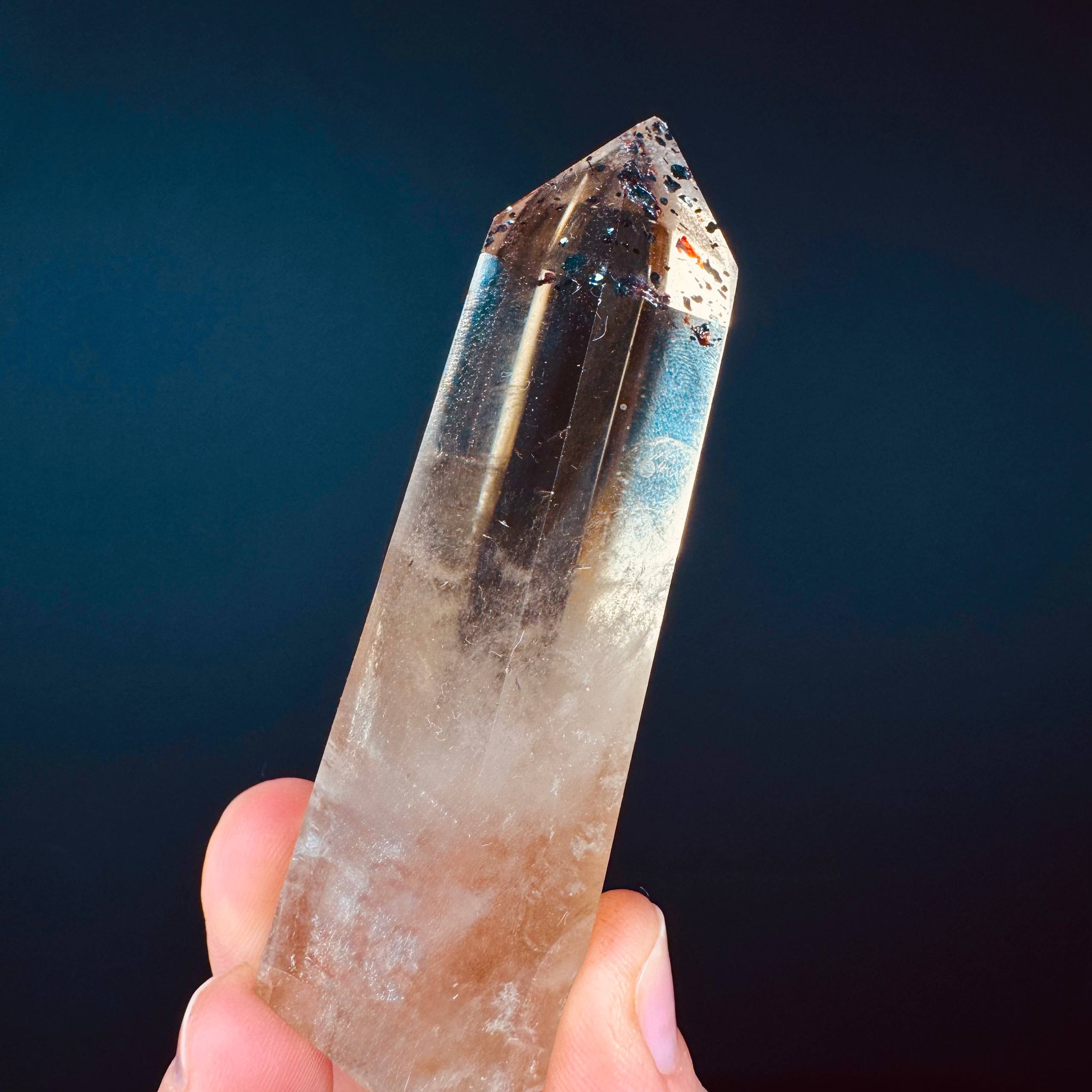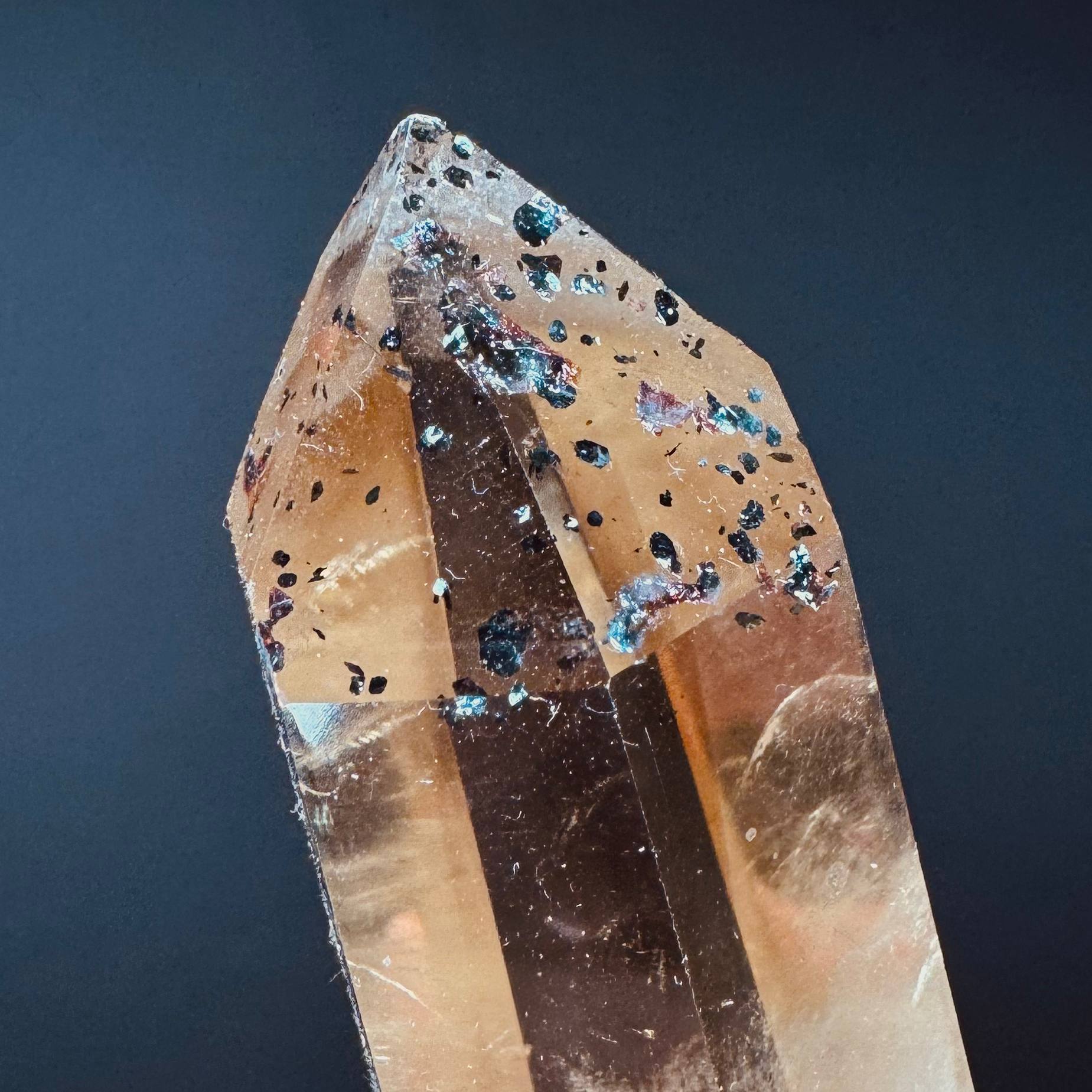 Il Punta di Quarzo Citrino con Ematite è una combinazione rara in cui luce e materia si incontrano senza separarsi. Questo cristallo è rarissimo ed estremamente prezioso.