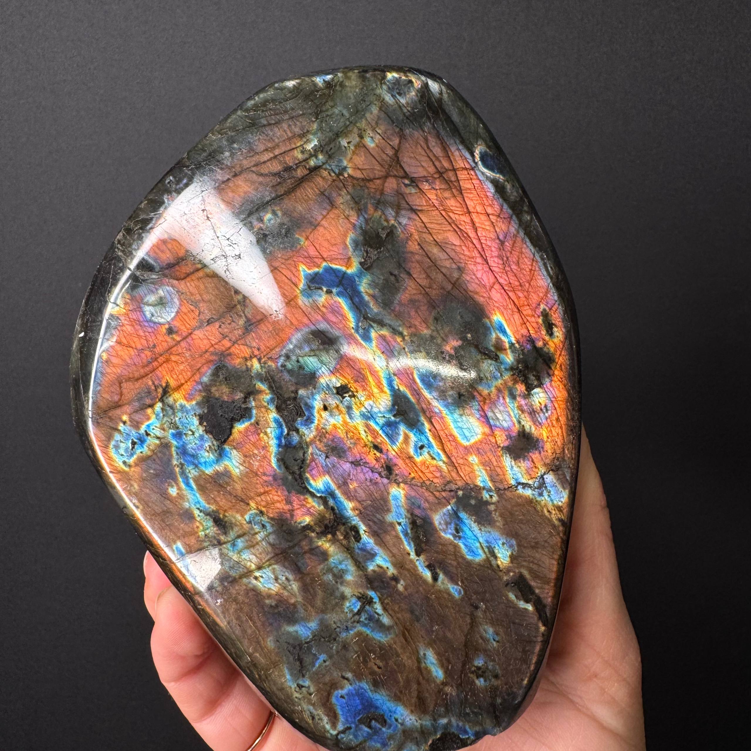 La Labradorite Oro-Rubino e Magenta è un cristallo raro che manifesta una luce interna complessa, in cui profondità e calore si incontrano in modo armonico. I suoi riflessi non si limitano ai toni più comuni, ma aprono a una combinazione più ampia, capace di sostenere sia la percezione sottile che la presenza concreta.