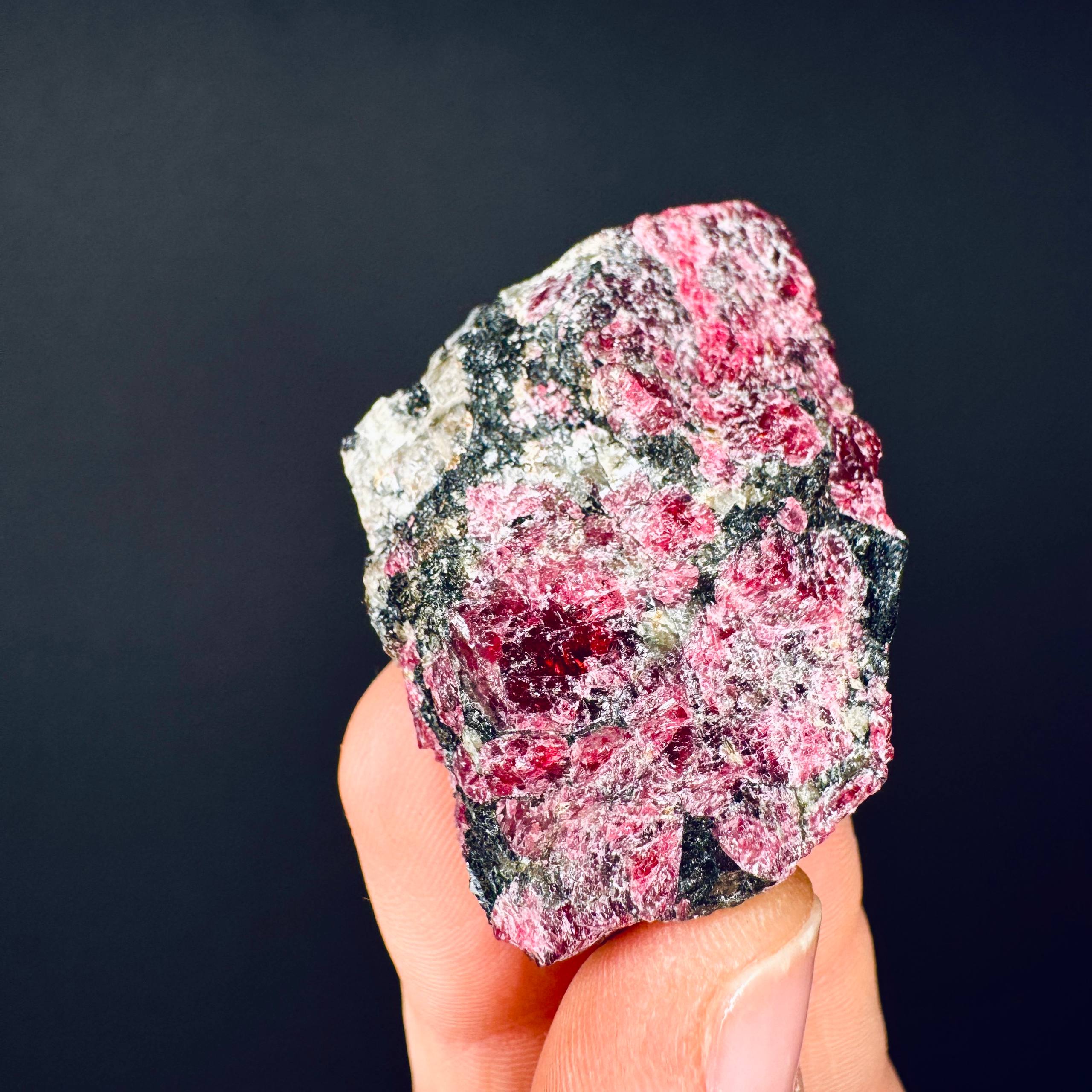 L’Eudialite Grezza è un minerale caratterizzato da tonalità profonde che richiamano il raggio magenta, una frequenza legata ai processi di integrazione tra cuore e materia. Il suo nome deriva dal greco eu (“buono”) e dialytos (“scomponibile”), suggerendo una qualità capace di sciogliere e riorganizzare ciò che è irrigidito.