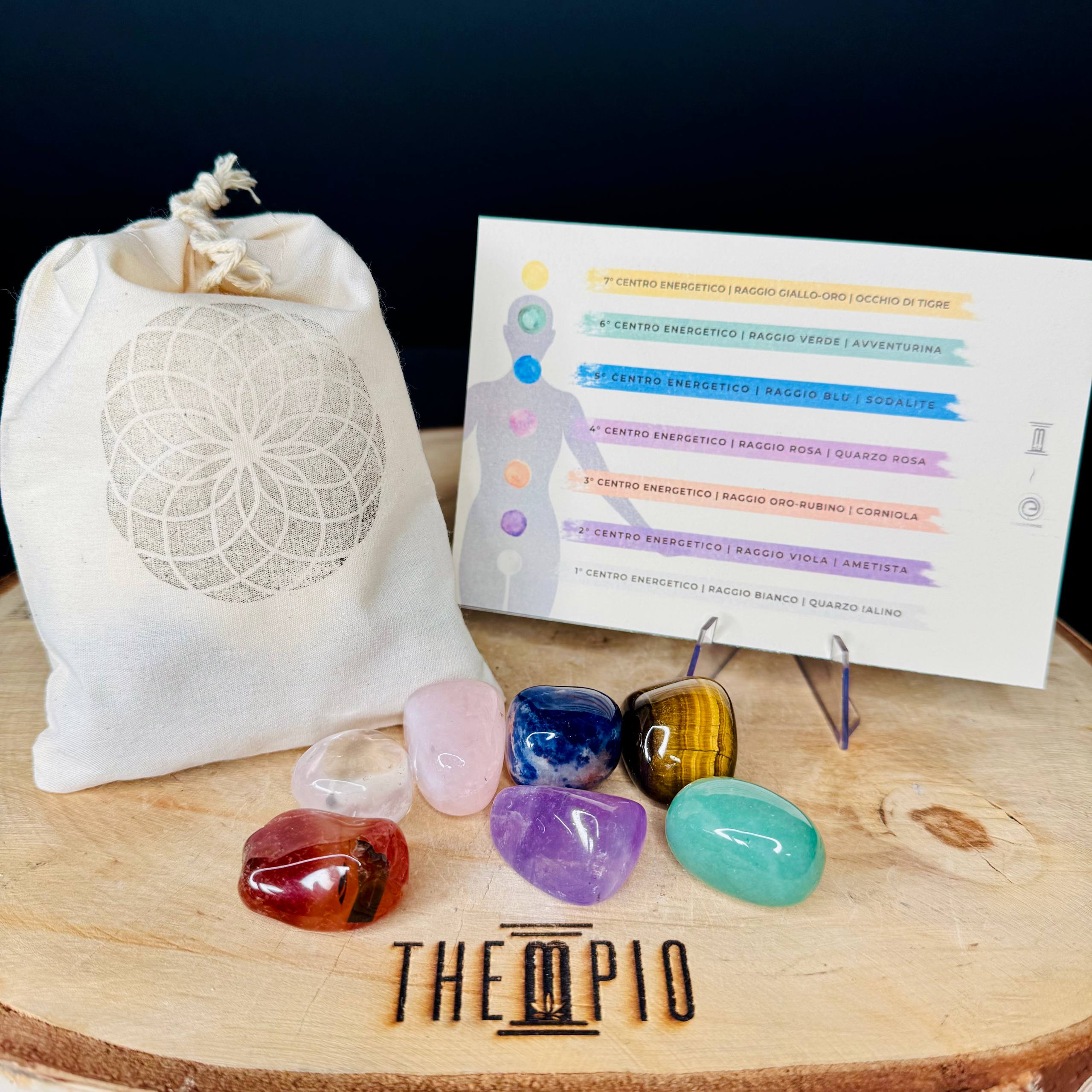 Vi propongo questo set all’interno di un sacchettino su cui abbiamo stampato (con le nostre mani, grazie a un timbro speciale) la geometria sacra del Toroide,